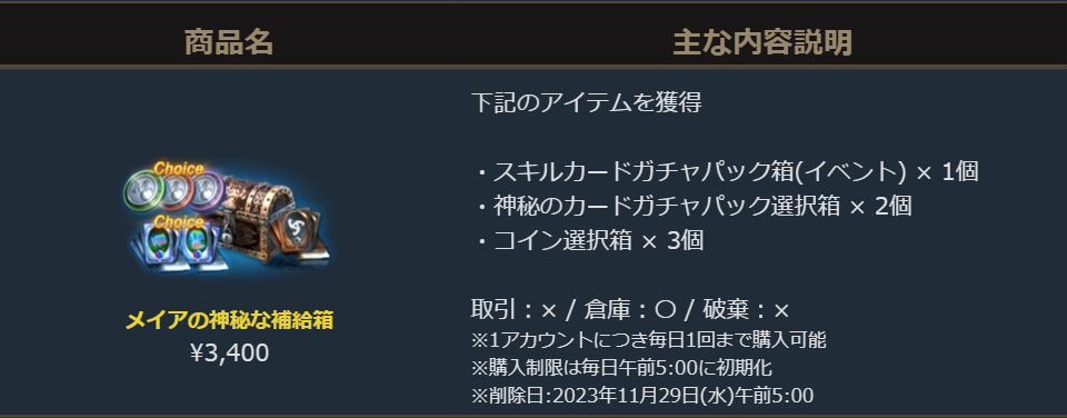 2023年11月8日より販売を開始しました「メイアの神秘な補給箱」のご案内を申し上げます。