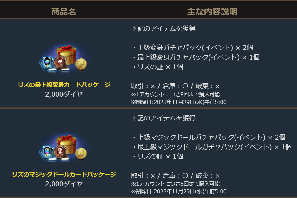 「最上級変身ガチャパック(イベント)1個」や「最上級マジックドールガチャパック(イベント)1個」と一緒に「上級変身ガチャパック(イベント)」や「上級マジックドールガチャパック(イベント)」で沢山の変身カード、マジックドールカードが獲得出来るパッケージです。
