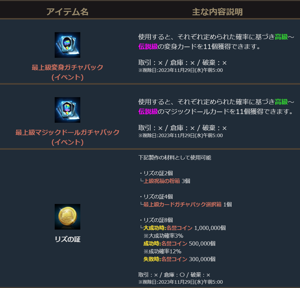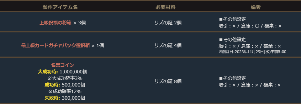さらに、付属の「リズの証」を材料として「最上級カードガチャパック選択箱」等のアイテムの製作が可能です。