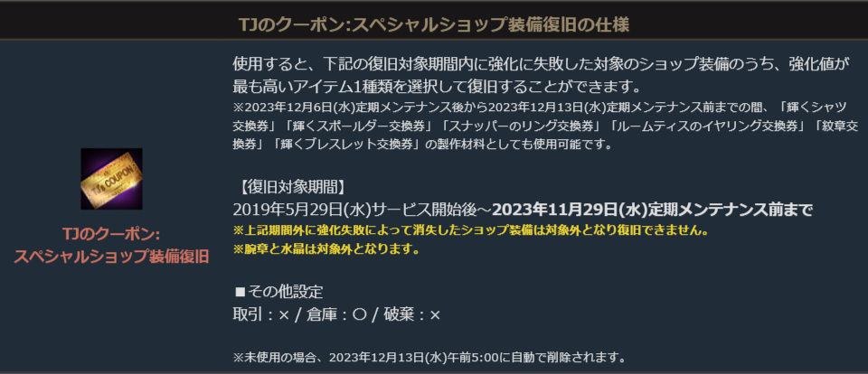 TJのクーポン:スペシャルショップ装備復旧は、対象期間内で強化失敗したショップ装備を復旧することができる特別なアイテムです。