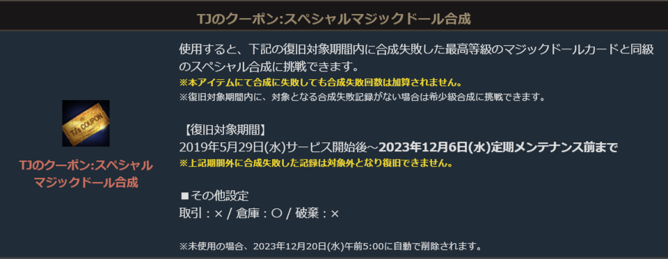 TJのクーポン:スペシャルマジックドール合成は、対象期間内に合成失敗した最高等級のマジックドールカードの合成に、成功時と失敗時の候補を選択して再挑戦できる特別なアイテムです。