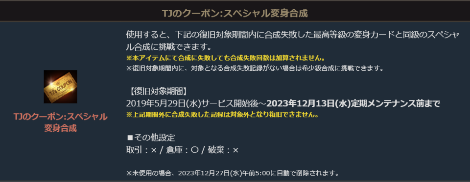 TJのクーポン:スペシャル変身合成は、対象期間内に合成失敗した最高等級の変身カードの合成に、成功時と失敗時の候補を選択して再挑戦できる特別なアイテムです。