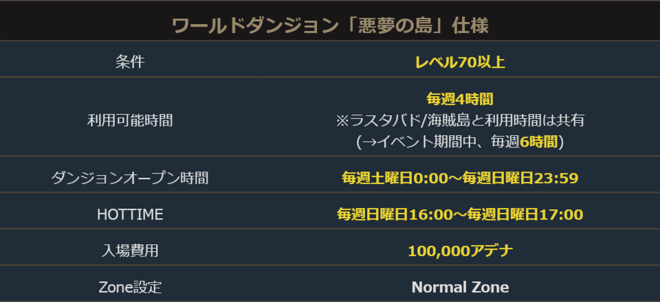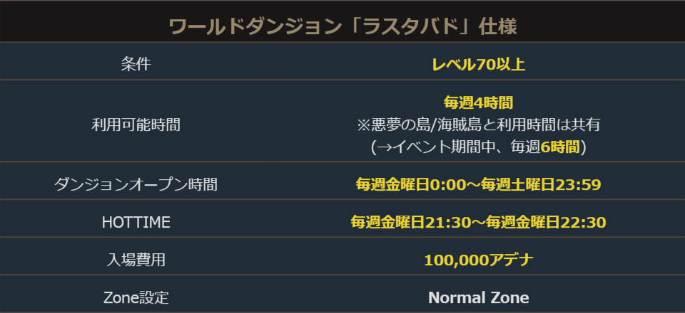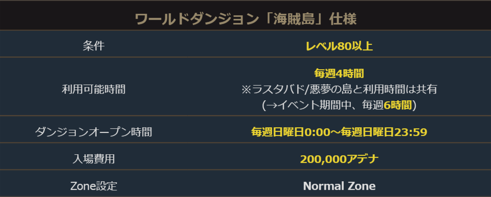 イベント期間中、週末ワールドダンジョン「ラスタバド」「海賊島」「悪夢の島」の利用可能時間が4時間から増加し6時間になります。