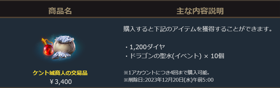 ダイヤ1,200個で3,400円という価格はそのままに、アインハザードの祝福と経験値を獲得出来る「ドラゴンの聖水(イベント)」が付いてくるお得なパッケージです。