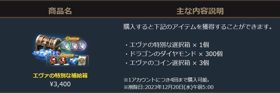 様々なアイテムを選択して獲得が可能な「エヴァの特別な選択箱」と一緒に選択したコインをたくさん手に入れる事が可能な「エヴァのコイン選択箱」や「ドラゴンのダイヤモンド」が獲得できるお得なパッケージです。