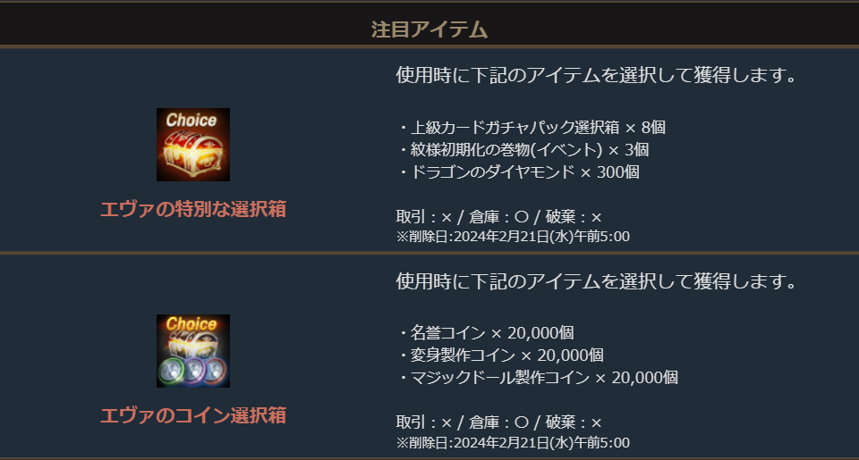 ※一部アイテムは未使用の場合、一定期間が経過すると自動で削除されます。詳しくは各アイテムの詳細をご確認ください。