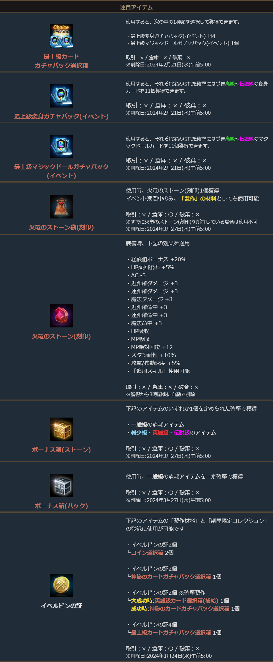※一部アイテムは未使用の場合、一定期間が経過すると自動で削除されます。詳しくは各アイテムの詳細をご確認ください。