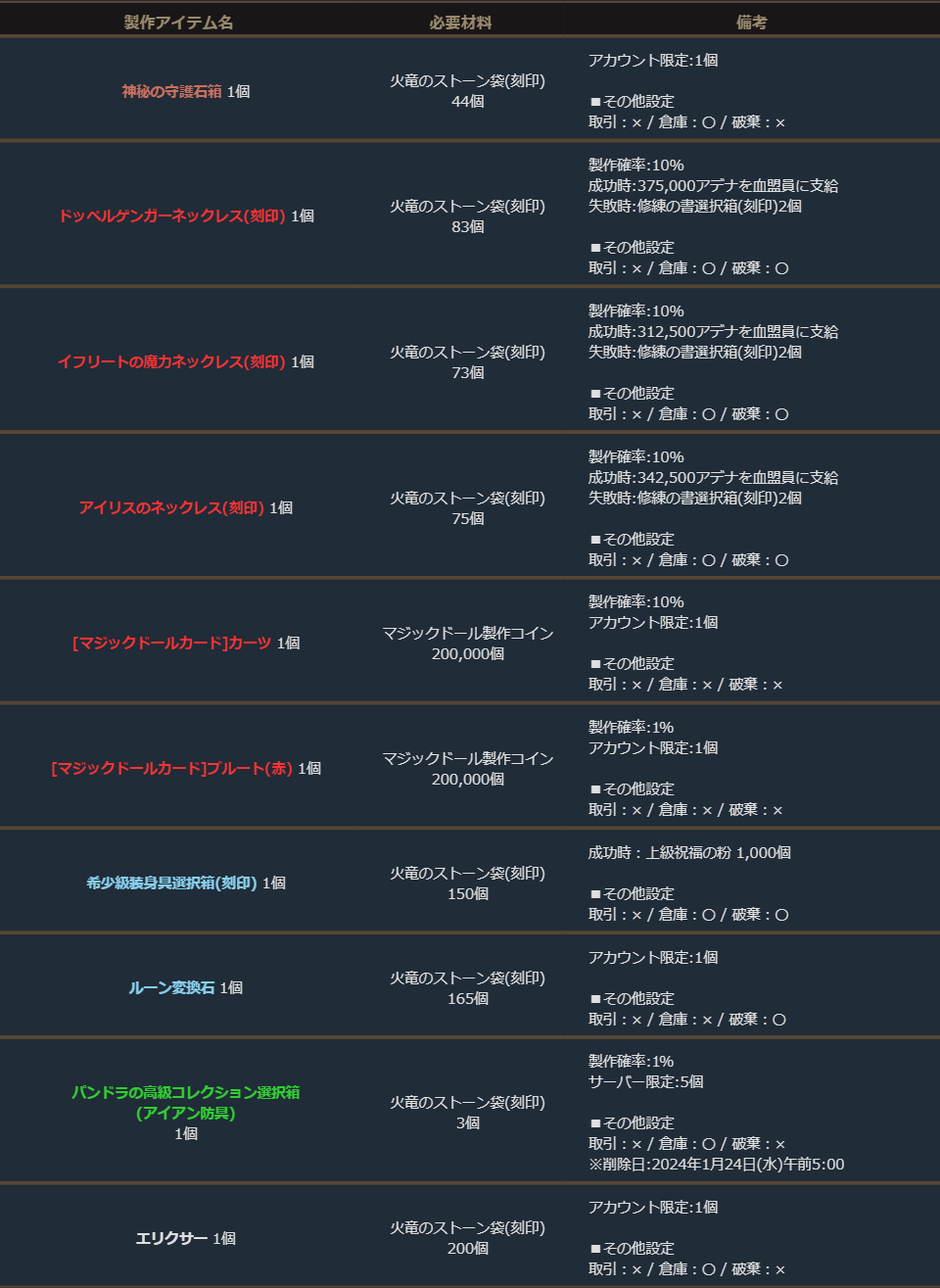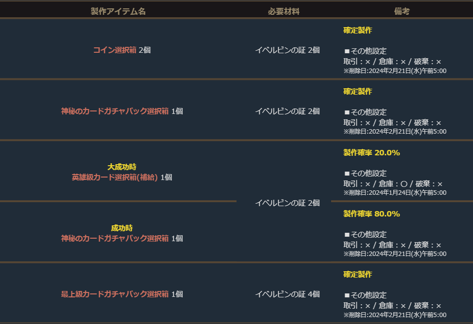 下記のアイテムは製作可能期間のみ製作することができます。