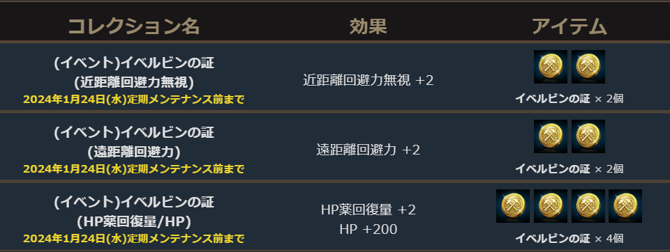 ・「イベルビンの証」期間限定コレクションリスト