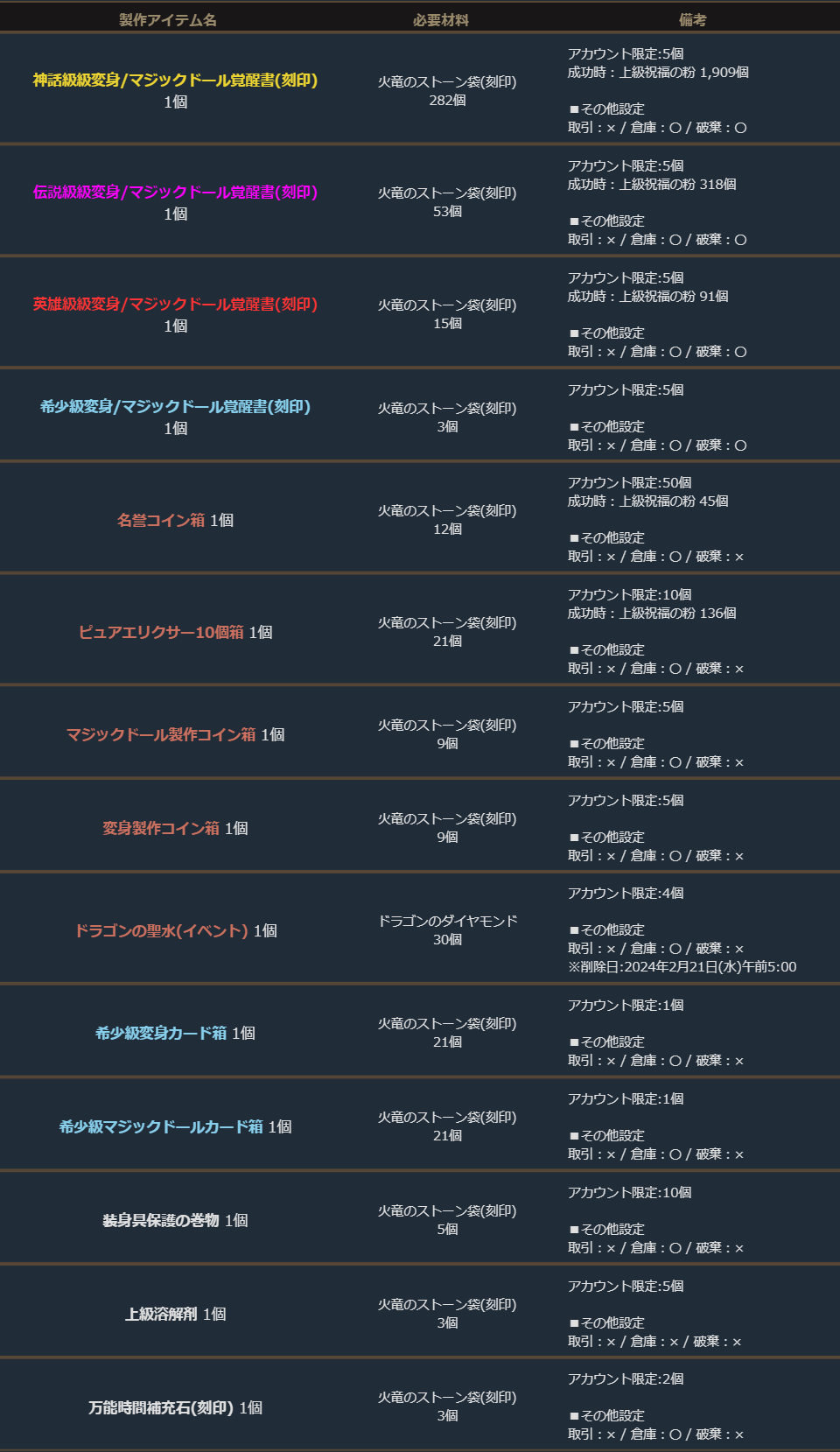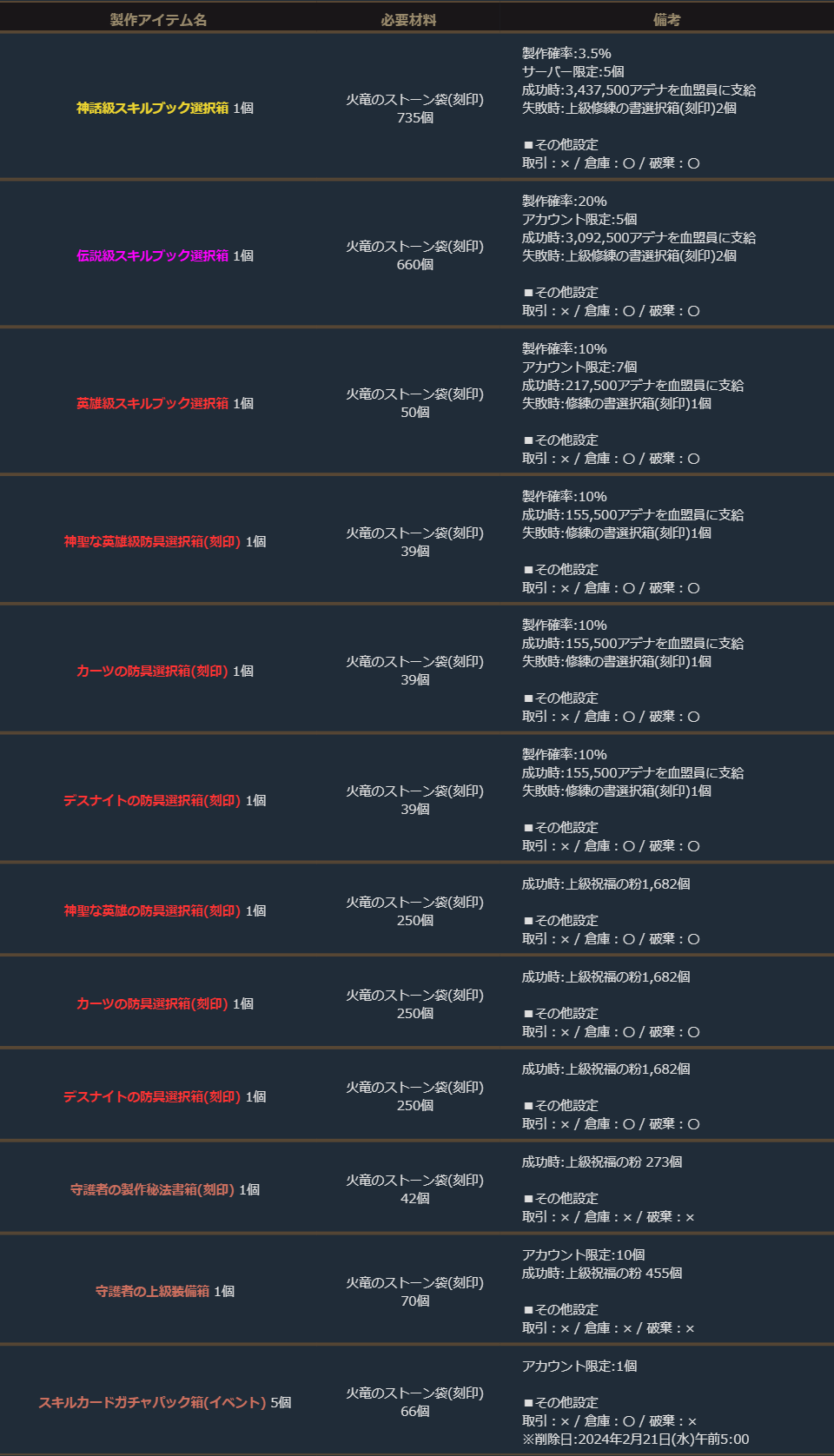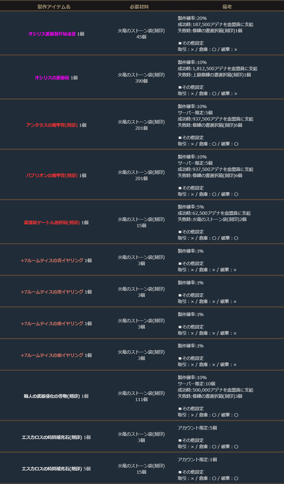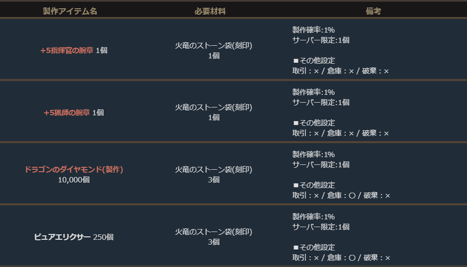 期間中、「火竜のストーン袋(刻印)」を使用して、下記の製作を行うことができます。