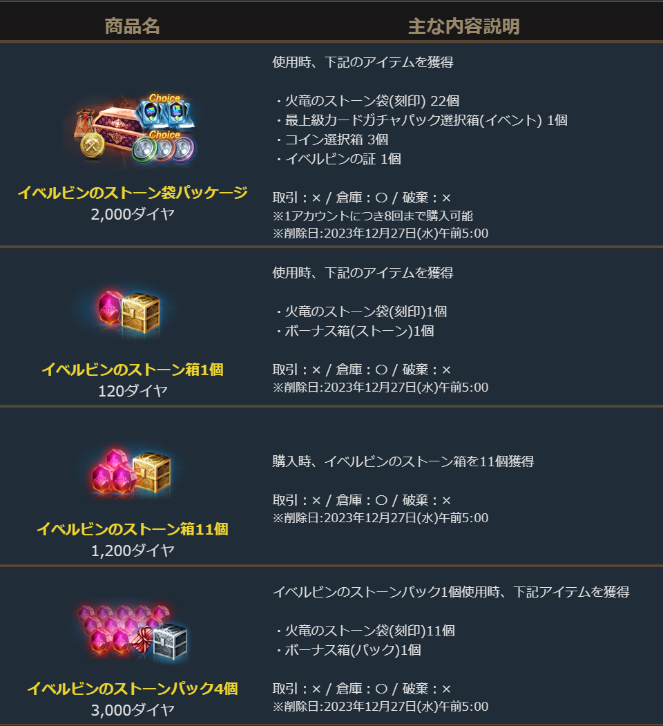 特別な製作の材料として使用可能で、そのまま使用した場合でも様々なバフ効果が得られる「火竜のストーン袋(刻印)」を含む様々なパッケージが登場しました。