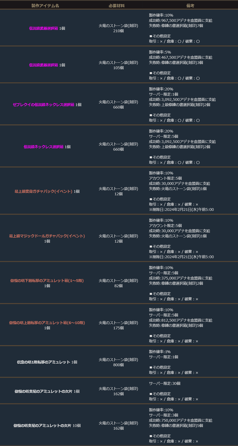 ※サーバー数量限定の製作アイテムは、各サーバーで製作できる数量に上限があります。