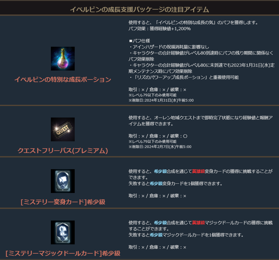 「イベルビンの成長支援パッケージ」は、レベル79以下のキャラクターのみが購入可能な主に成長を支援するパッケージとなります。
