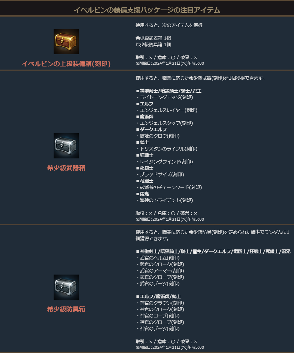 「イベルビンの装備支援パッケージ」は、刻印の希少級武器や希少級防具、強化済みの装身具などが獲得できるパッケージとなります。