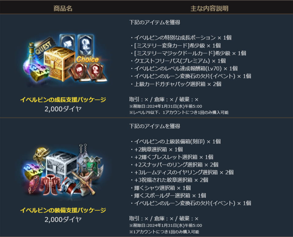 販売期間中、ゲーム内ショップより「イベルビンの成長支援パッケージ」と「イベルビンの装備支援パッケージ」をそれぞれ2,000ダイヤで販売いたします。