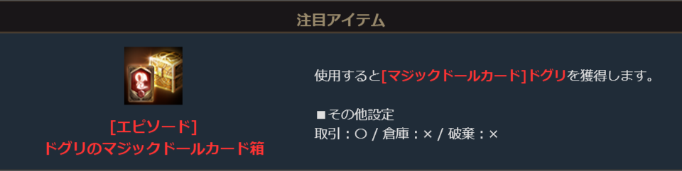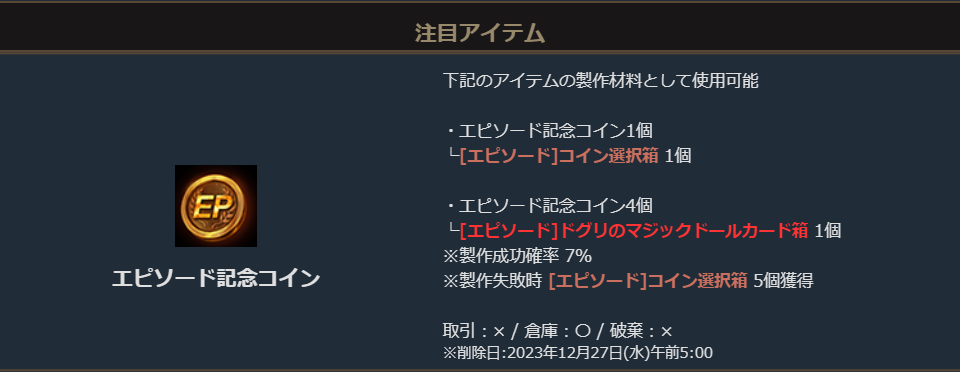 付属の「エピソード記念コイン」4枚で英雄級「[エピソード]ドグリのマジックドールカード箱」の製作に挑戦できます。