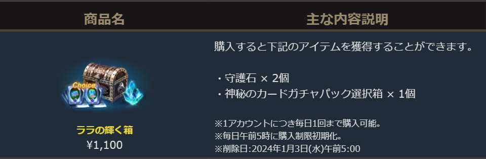 「神秘のカードガチャパック選択箱」1個と守護星の活性化の材料として使用できる「守護石」が2個獲得できる、毎日購入可能なお得なパッケージです。