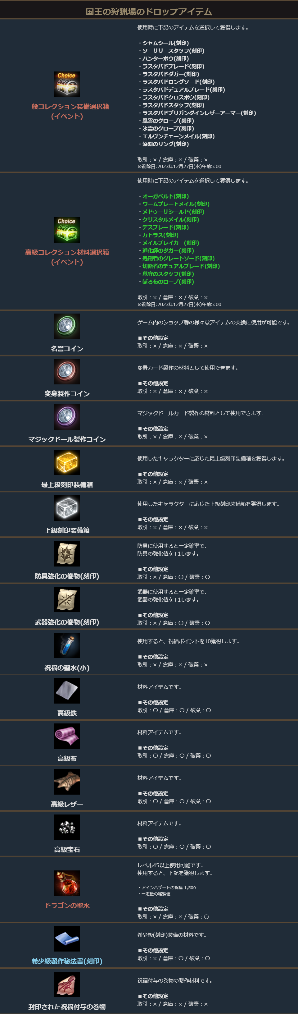 イベント期間中、国王の狩猟場におけるモンスターのドロップは下記となります。