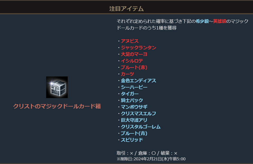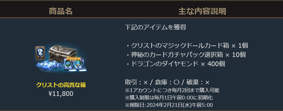 特定の希少級~英雄級マジックドールカードからなるリスト内のうち1種を獲得できる「クリストのマジックドールカード箱」に加え、「神秘のカードガチャパック選択箱」と「ドラゴンのダイヤモンド」が入った毎月2回まで購入可能なパッケージです。