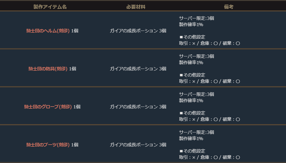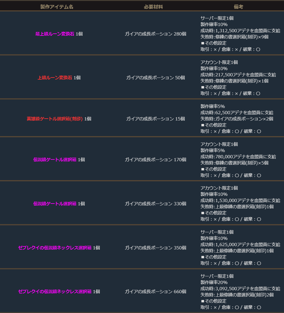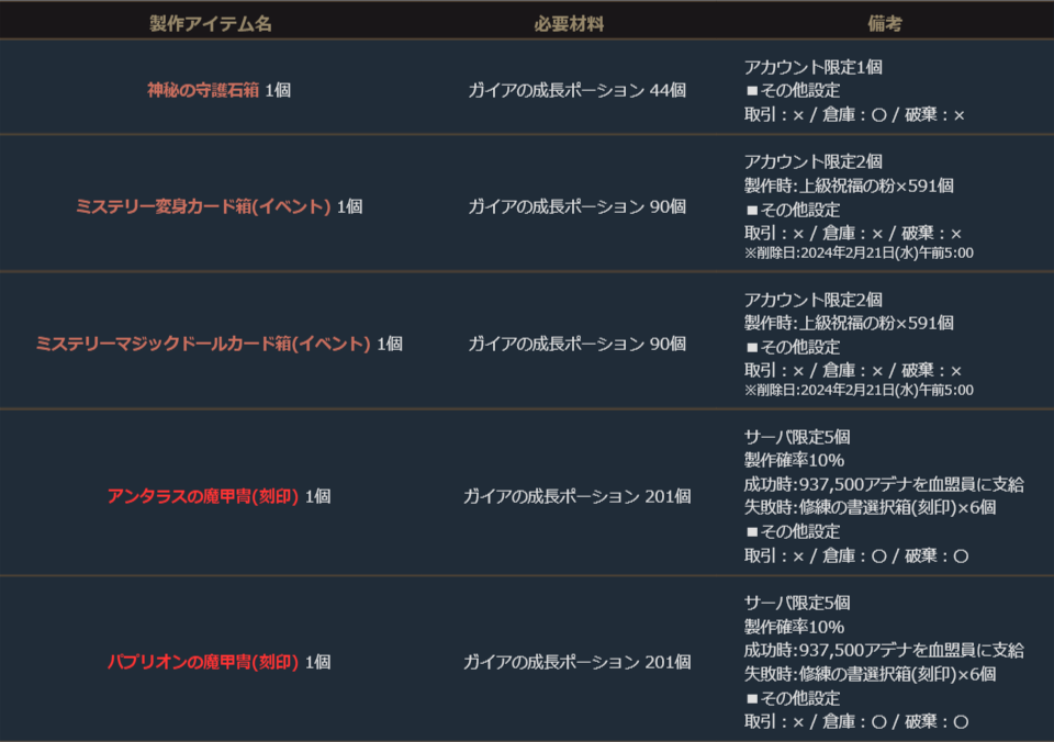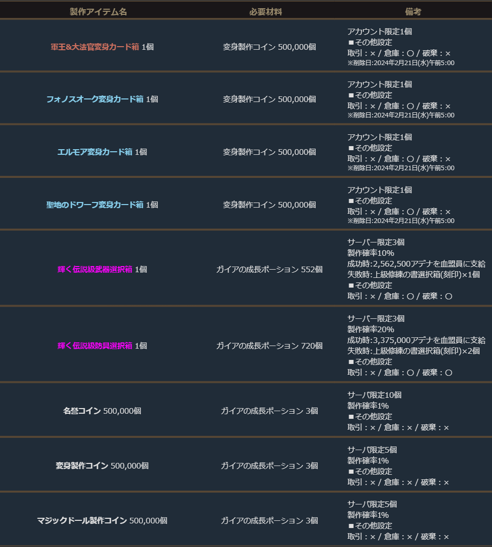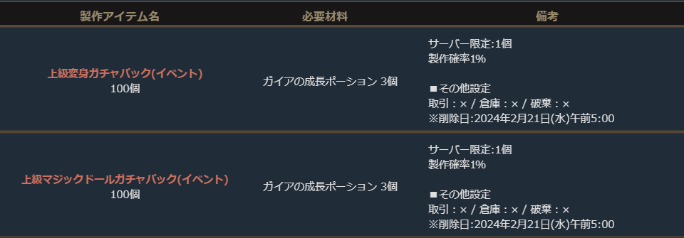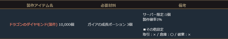 ※サーバー数量限定の製作アイテムは、各サーバーで製作できる数量に上限があります。