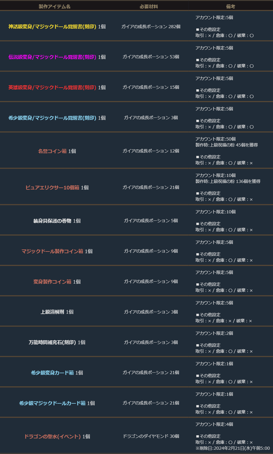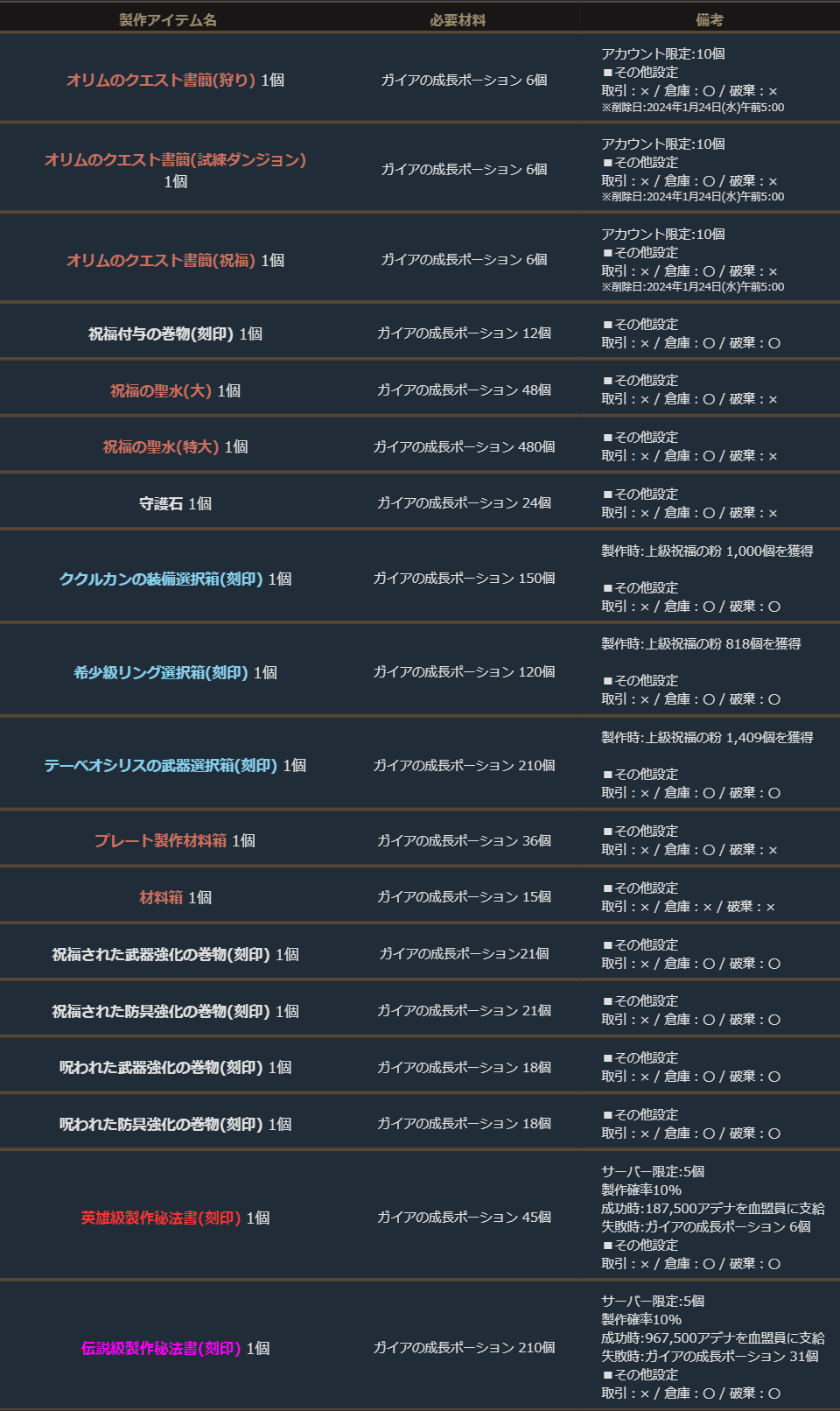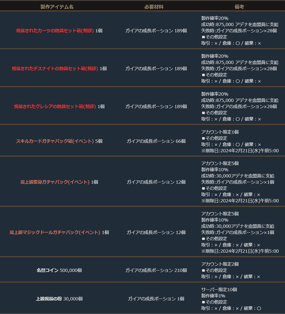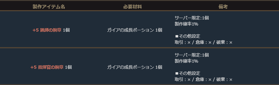 ※サーバー数量限定の製作アイテムは、各サーバーで製作できる数量に上限があります。
