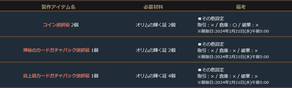 ※期間限定の製作アイテムは、製作可能期間のみゲーム内の「製作」より製作することができます。