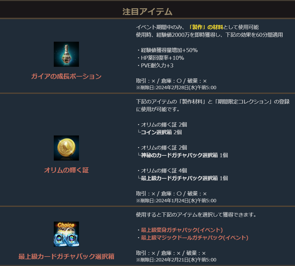 ※一部アイテムは未使用の場合、一定期間が経過すると自動で削除されます。詳しくは各アイテムの詳細をご確認ください。