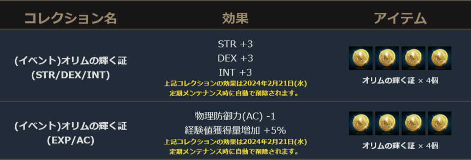 ・「オリムの輝く証」期間限定コレクションリスト