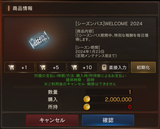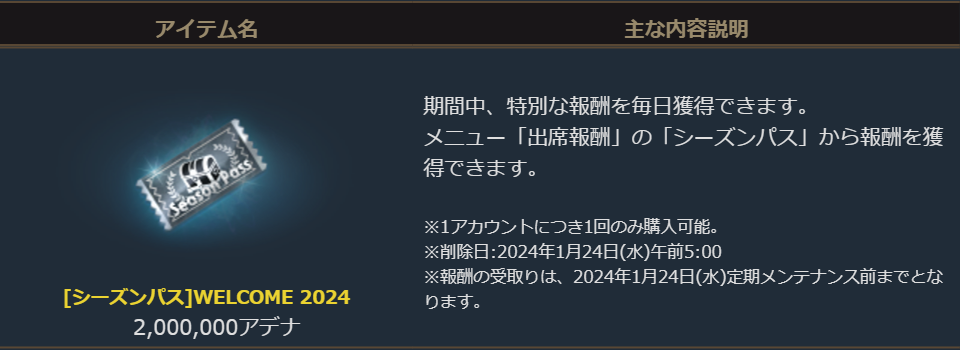 期間中、特別な報酬を毎日獲得可能になる[シーズンパス]WELCOME 2024をゲーム内ショップよりアデナにて交換が可能です。
