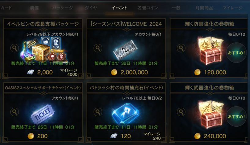 1.ショップの「イベント強化」画面から「[シーズンパス]WELCOME 2024」を2,000,000アデナと交換