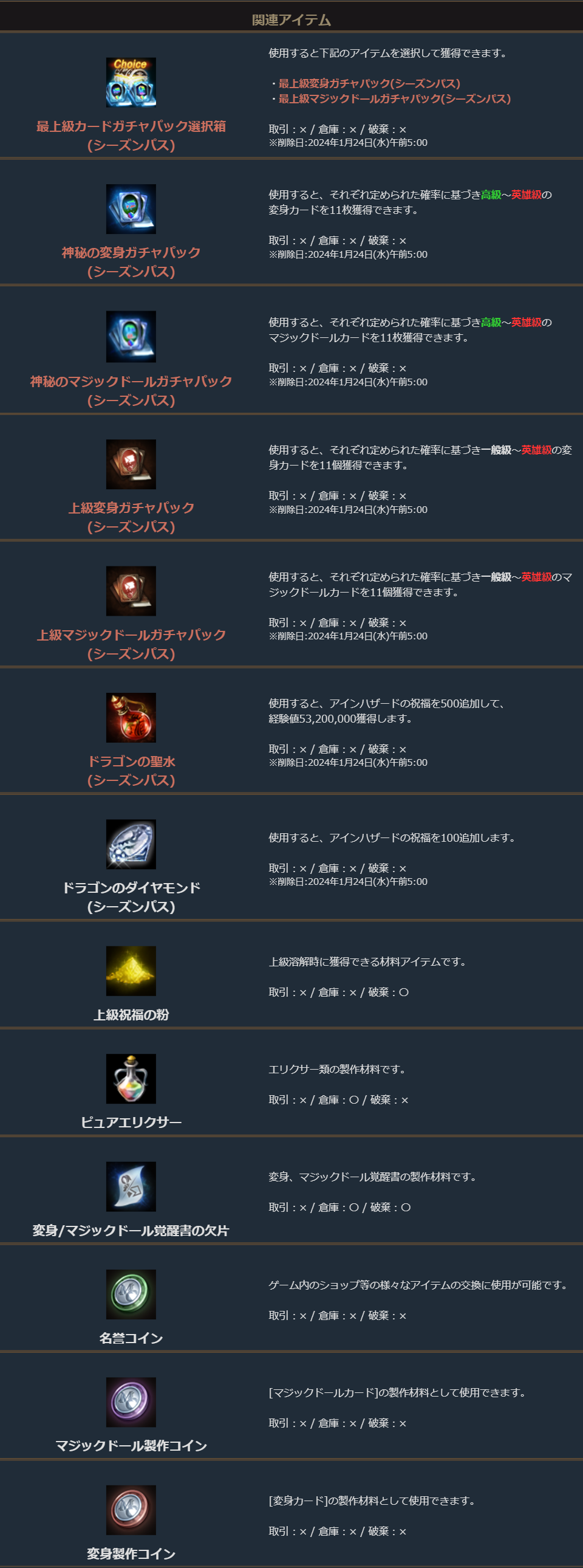 ※一部アイテムが期間終了後も未使用の場合、一定期間が経過すると自動で削除されます。詳しくは各アイテムの詳細をご確認ください。