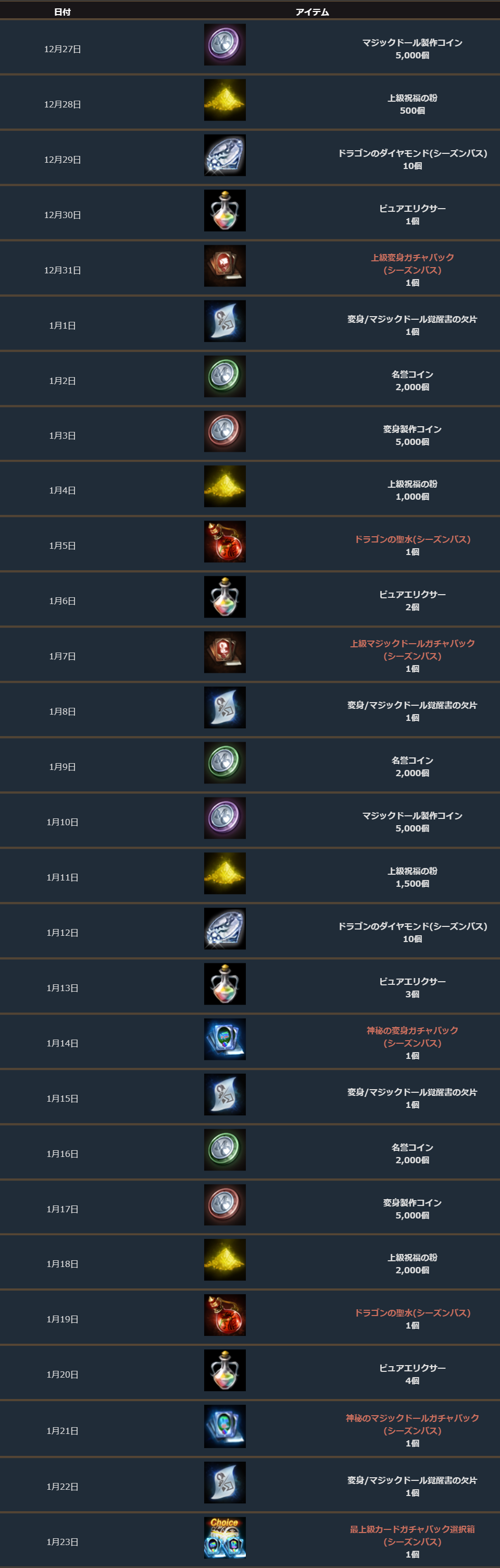 下記の日付以降にそれぞれの報酬を獲得できます。