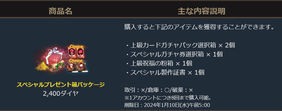 「上級カードガチャパック選択箱」と「スペシャル変身ガチャ券選択箱」「上級祝福の粉箱」が手に入るパッケージです。
