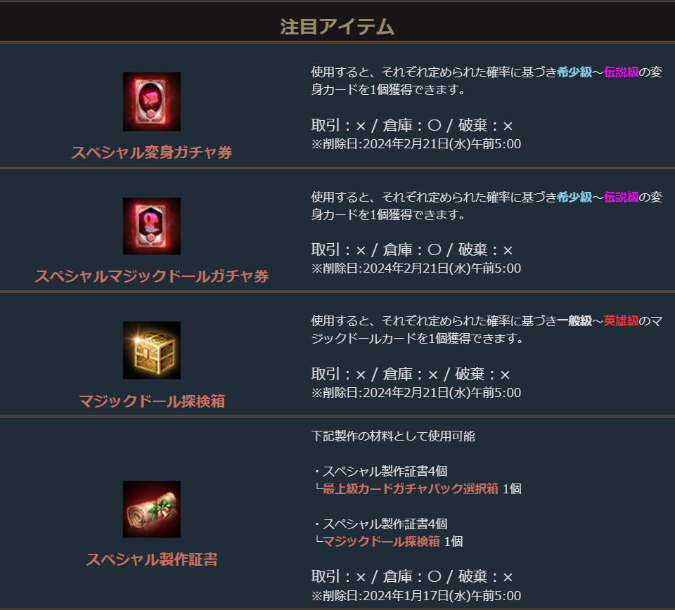 ※一部アイテムは未使用の場合、一定期間が経過すると自動で削除されます。詳しくは各アイテムの詳細をご確認ください。