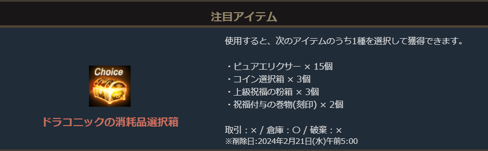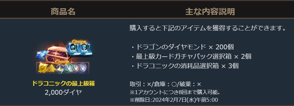 「ドラゴンのダイヤモンド200個」と「最上級カードガチャパック選択箱2個」に加え、キャラクター強化に役立つ様々なアイテムのうち1種を選択して獲得出来る「ドラコニックの消耗品選択箱3個」が入ったお得なパッケージです。