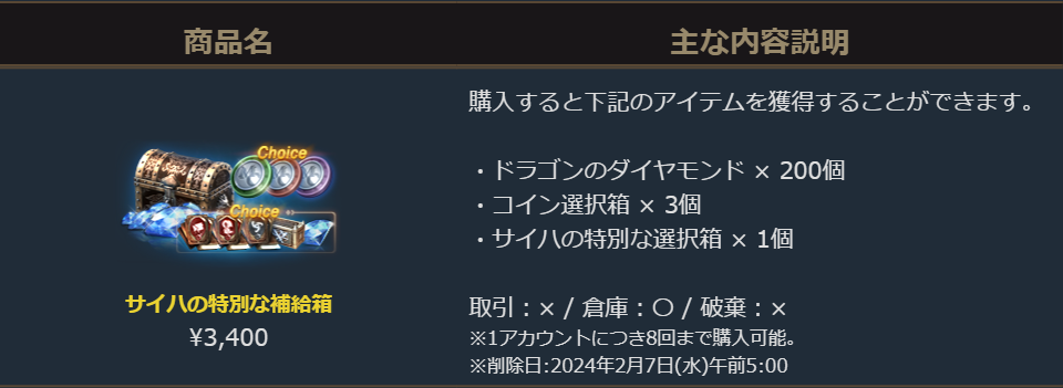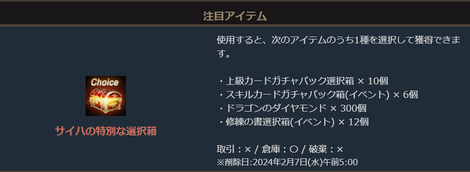 「ドラゴンのダイヤモンド200個」と「コイン選択箱3個」と一緒に様々なアイテムのうち1種を選択して獲得できる「サイハの特別な選択箱1個」が入ったパッケージです。