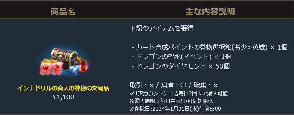 「ドラゴンのダイヤモンド」と「ドラゴンの聖水(イベント)」と一緒に合成ポイントを増加させる事が可能な「カード合成ポイントの巻物選択箱(希少>英雄)」を獲得できるパッケージです。