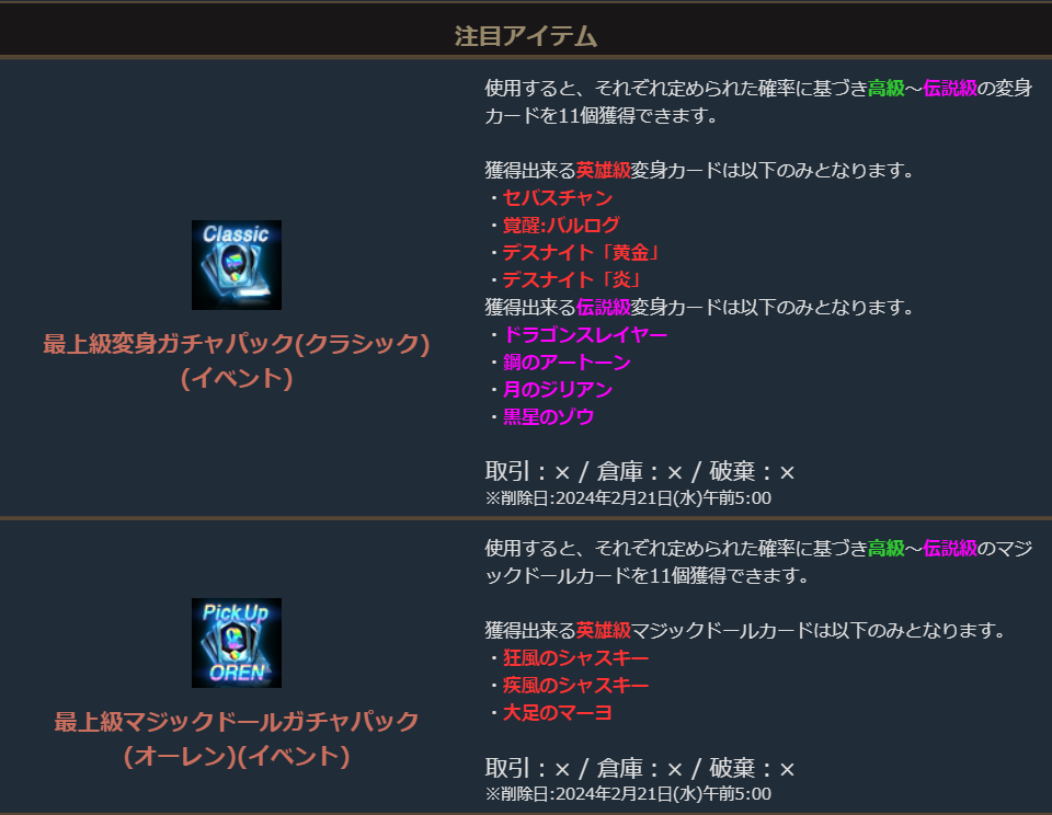 ※一部アイテムは未使用の場合、一定期間が経過すると自動で削除されます。詳しくは各アイテムの詳細をご確認ください。