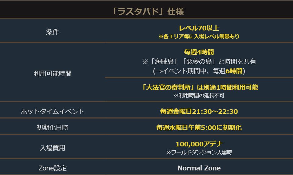 イベント期間中、週末ワールドダンジョン「ラスタバド」「海賊島」「悪夢の島」の利用可能時間が4時間から増加し6時間になります。