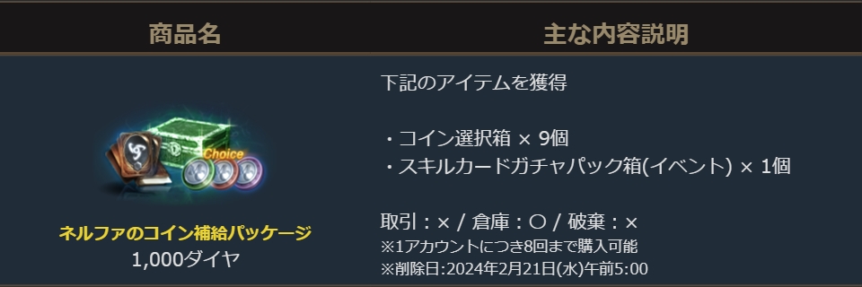 2024年2月14日より販売を開始しました「ネルファのコイン補給パッケージ」のご案内を申し上げます。