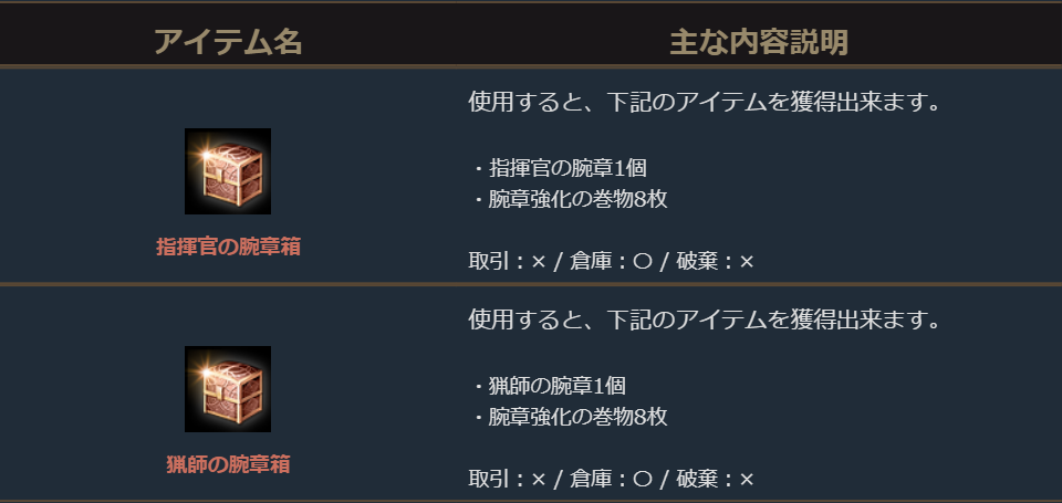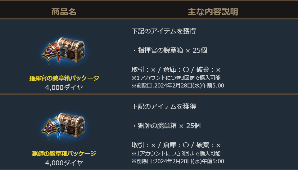 「指揮官の腕章箱25個」が入った「指揮官の腕章箱パッケージ」と、「猟師の腕章箱25個」が入った「猟師の腕章箱パッケージ」の2種類が登場しました。