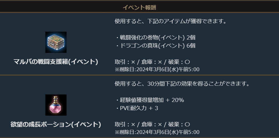 上記のデイリークエストを達成する事で「マルバの戦闘支援箱(イベント)」を獲得できます。