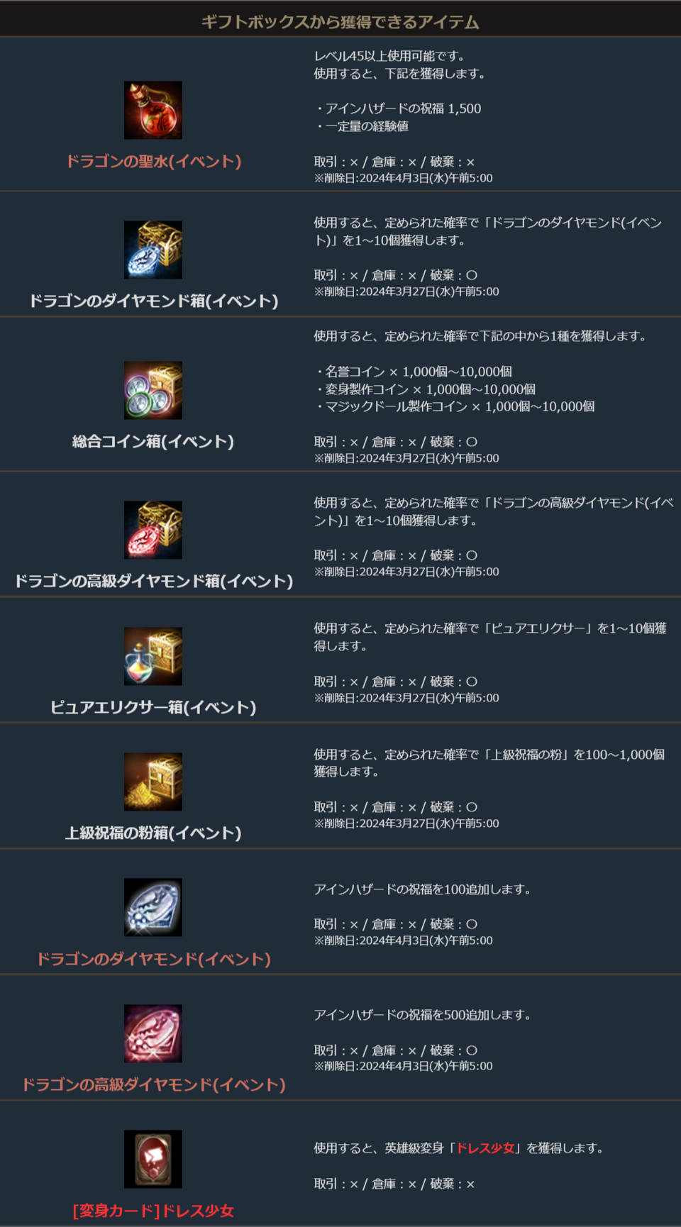 ダンジョン内にあるギフトボックスからは「ピュアエリクサー箱(イベント)」や「上級祝福の粉箱(イベント)」等を獲得できると共に、