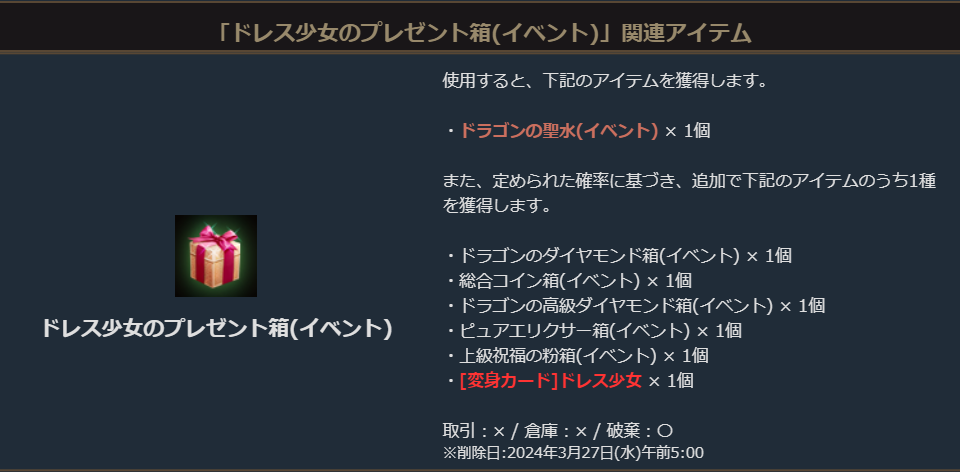 イベントアイテム「ドレス少女のプレゼント箱(イベント)」を使用すると「ドラゴンの聖水(イベント)」を獲得できる他、定められた確率に基づき、追加で報酬を獲得することが出来ます。