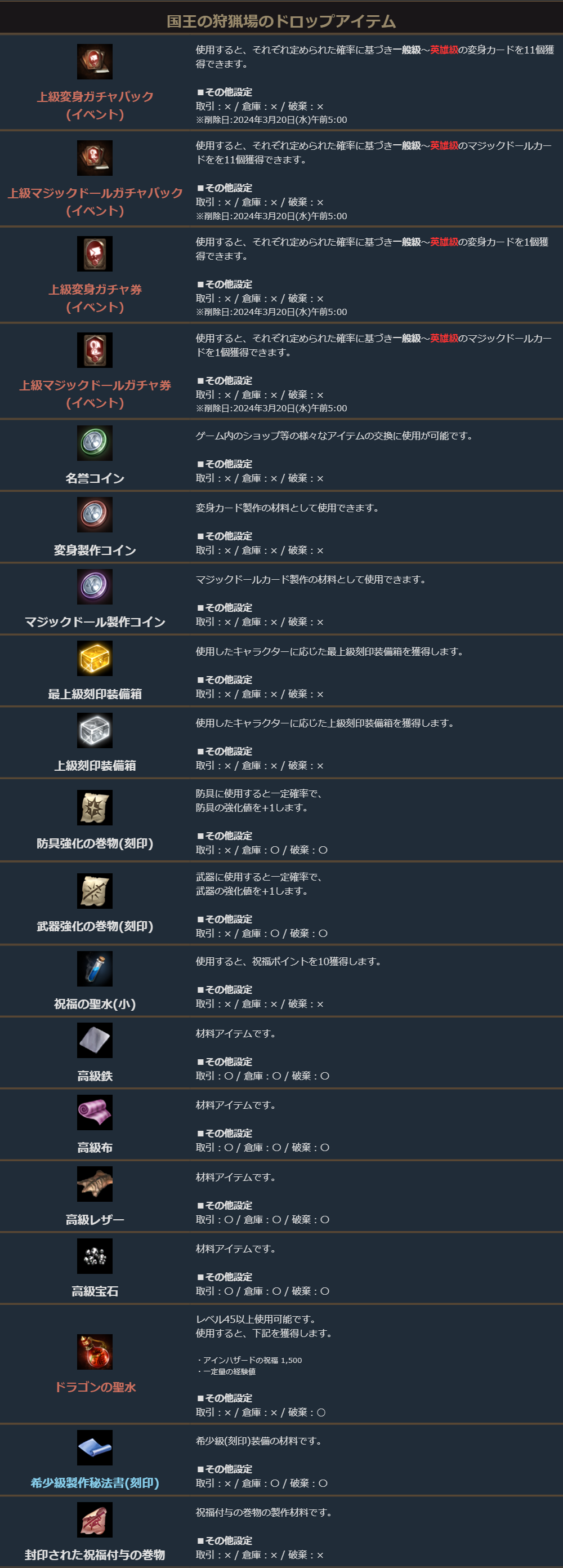イベント期間中、国王の狩猟場におけるモンスターのドロップは下記となります。
