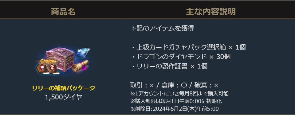 「リリーの補給パッケージ」に含まれる削除日が「2024年5月1日(水)午前5:00」に設定されていたものにつきまして、以下の通り削除日を変更致しました。