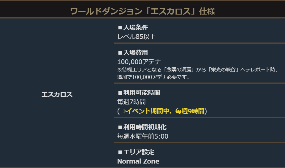 イベント期間中、ワールドダンジョン「エスカロス」シーズンダンジョン「エオディン城塞」の利用可能時間が7時間から増加し9時間になります。