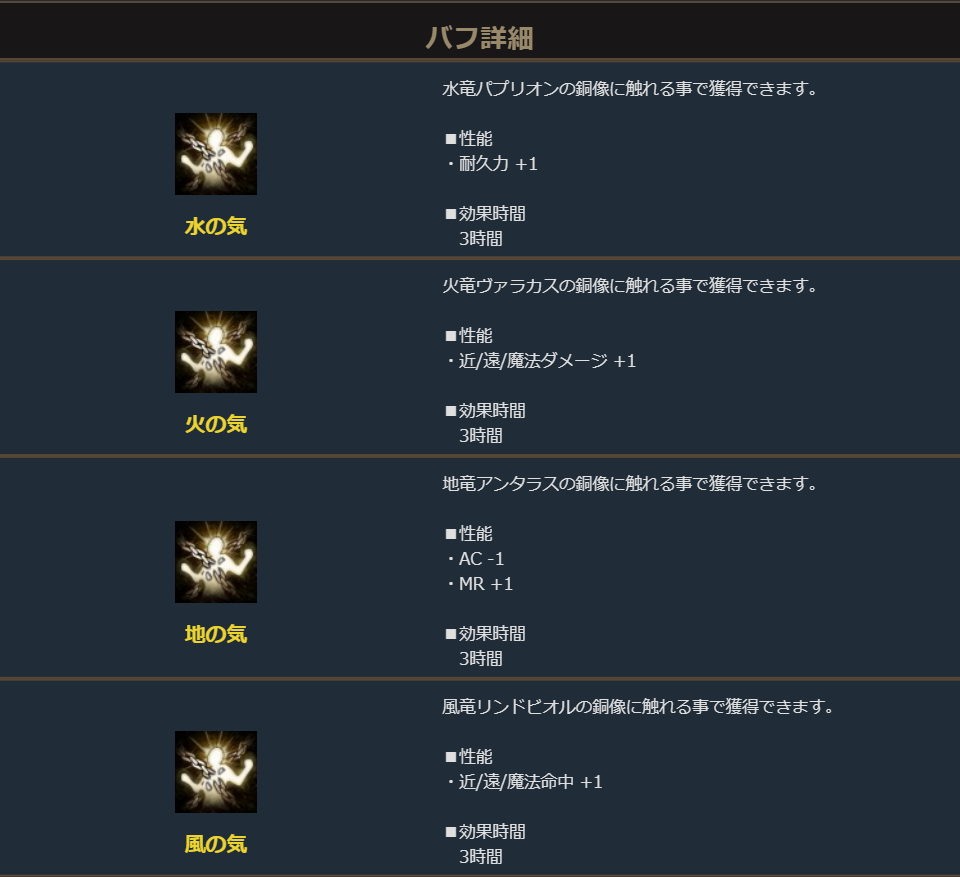 イベント期間中、「ギラン村」に四体の竜のイベントバフ銅像(?)が出現します。