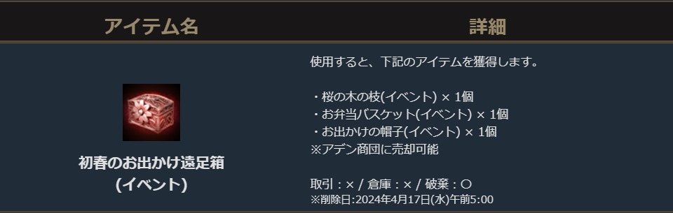 また、「初春のお出かけ遠足箱(イベント)」「桜の木の枝(イベント)」「お弁当バスケット(イベント)」「お出かけの帽子(イベント)」はアデン商団に売却する事も可能です。