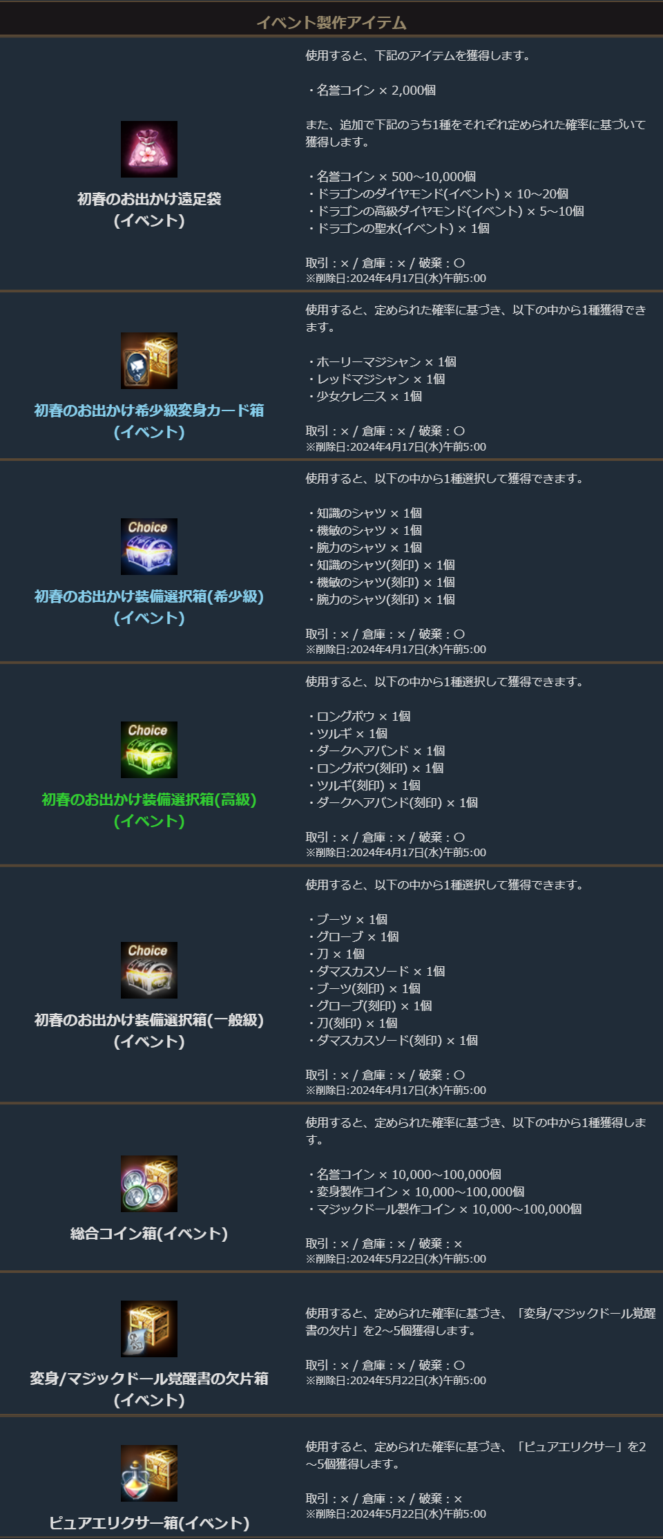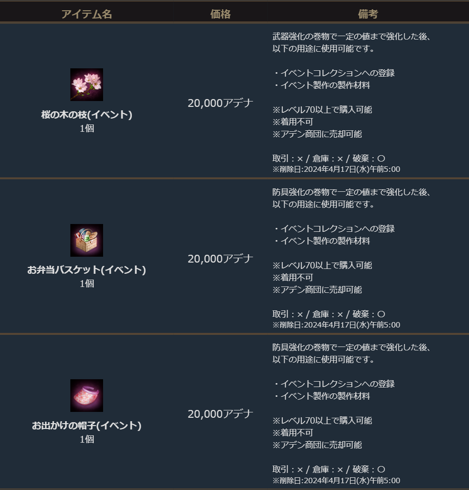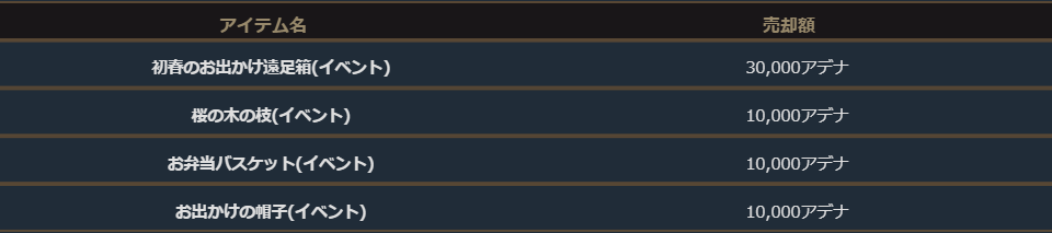 「初春のお出かけ遠足箱(イベント)」「桜の木の枝(イベント)」「お弁当バスケット(イベント)」「お出かけの帽子(イベント)」は以下の売却額でアデン商団に売却する事も可能です。